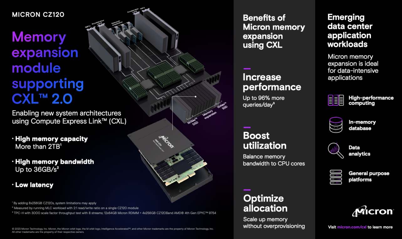對于云服務廠商而言,CXL是一種更經濟高效的行業(yè)標準,通過CXL可以實現(xiàn)計算、存儲和內存資源的分離,更容易實現(xiàn)各類計算和存儲資源的自由收縮拓展,從而構建更高效的服務器架構。美光展出的CXL內存擴展模組——CZ120,提供128GB和256GB兩個不同版本,能夠提供高達36GB/s的讀/寫帶寬,助力服務器廠商打造高達2TB內存容量的服務器。