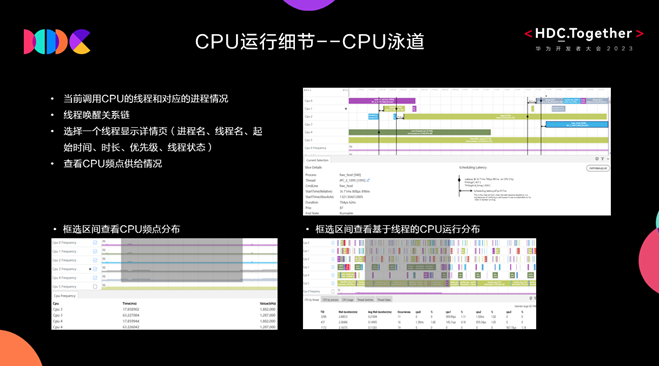 若測(cè)試人員關(guān)注CPU和線程運(yùn)行細(xì)節(jié),則可以從泳道圖繼續(xù)查看。其中CPU泳道圖提供細(xì)節(jié)數(shù)據(jù)如下: