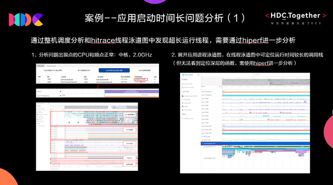 如圖我們可看到問(wèn)題在于某個(gè)應(yīng)用啟動(dòng)時(shí)間比較長(zhǎng),首先通過(guò)通過(guò)整機(jī)調(diào)度分析模板能夠發(fā)現(xiàn)tb線程單次運(yùn)行時(shí)間長(zhǎng)達(dá)79.31ms,且通過(guò)CPU泳道確認(rèn)該線程運(yùn)行在中核,2.0GHz,因此CPU資源供給沒(méi)有問(wèn)題;接下來(lái),我們展開(kāi)應(yīng)用進(jìn)程泳道圖,在線程泳道圖中可定位出運(yùn)行時(shí)間較長(zhǎng)的階段(但無(wú)法看到深層的函數(shù),需使用hiperf進(jìn)一步分析)。