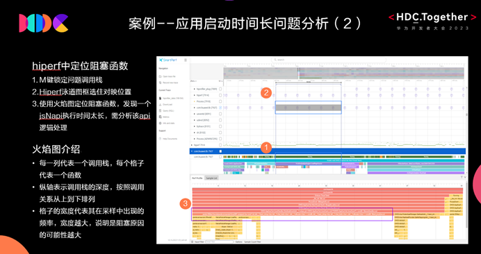 我們直接通過(guò)抓取Hiperf做進(jìn)一步分析。首先基于上面已經(jīng)發(fā)現(xiàn)的運(yùn)行時(shí)間長(zhǎng)階段,通過(guò)M鍵進(jìn)行鎖定,然后在Hiperf泳道圖中選中對(duì)應(yīng)位置,最后使用火焰圖定位阻塞函數(shù),能夠發(fā)現(xiàn)一個(gè)jsNapi執(zhí)行時(shí)間太長(zhǎng)。