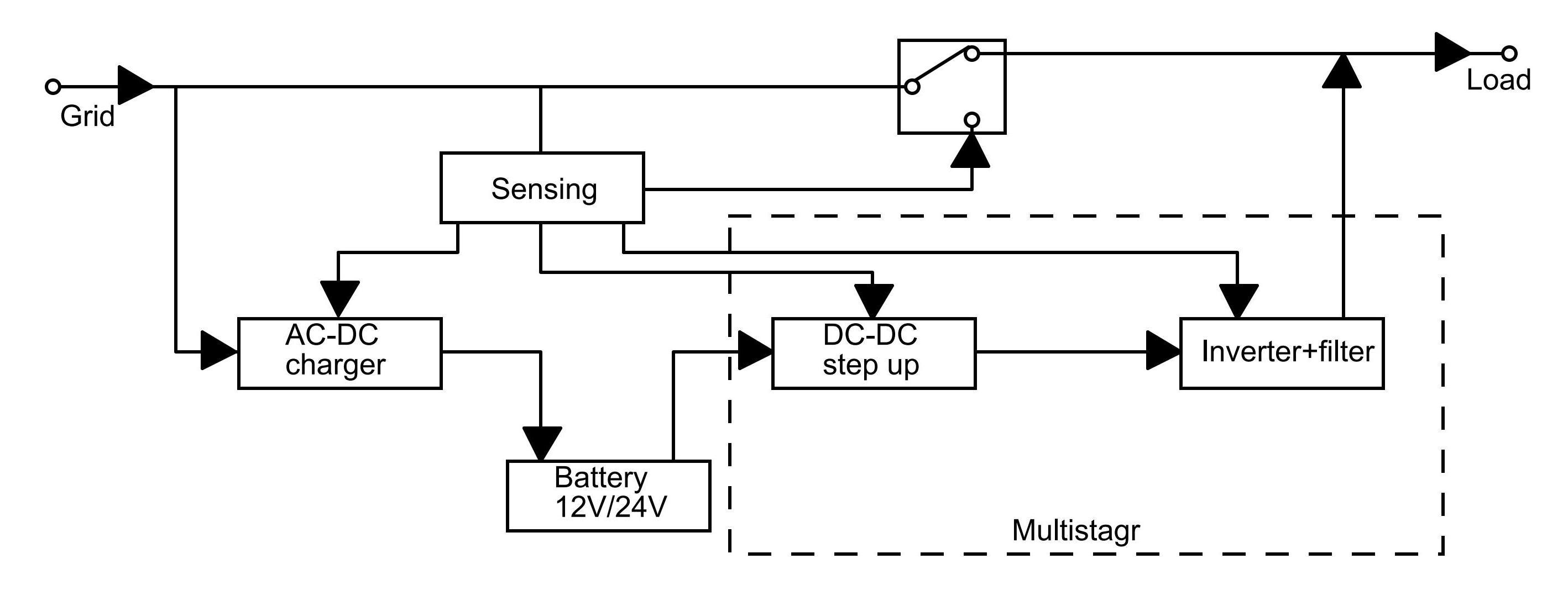 2、當(dāng)市電故障時(shí),由電池提供電力,經(jīng)逆變器輸出負(fù)載。