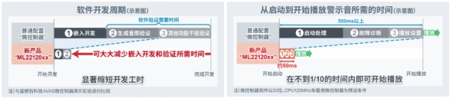 新產(chǎn)品是由硬件構(gòu)成的,與由微控制器構(gòu)成的產(chǎn)品相比,無(wú)需進(jìn)行軟件驗(yàn)證,可以大幅縮短開(kāi)發(fā)周期。此外,新產(chǎn)品可以用簡(jiǎn)單的命令進(jìn)行控制,與由微控制器生成聲音的普通方式相比,用不到1/10的時(shí)間即可發(fā)出警示音。除此之外,新產(chǎn)品還配有故障檢測(cè)功能,可檢測(cè)與主控微控制器之間的通信異常以及由外置元器件引起的異常振蕩,有助于提高應(yīng)用產(chǎn)品的可靠性。