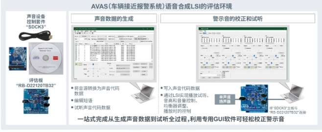 評(píng)估板“RB-D22120TB32”和專(zhuān)用GUI(Graphical User Interface)軟件通過(guò)聲音設(shè)備控制套件“SDCK3”的形式提供。利用該套件,客戶(hù)可輕松評(píng)估從生成音頻數(shù)據(jù)到校正和試聽(tīng)警示音的一系列過(guò)程。