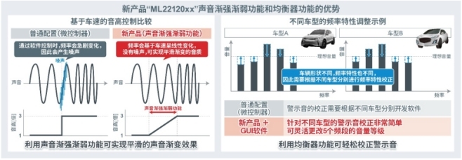 “ML22120xx”由具備警示音生成功能、聲音漸強(qiáng)漸弱功能和均衡器功能的專(zhuān)用硬件構(gòu)成。另外,通過(guò)使用專(zhuān)用的GUI軟件,可以輕松滿(mǎn)足相關(guān)法律法規(guī)對(duì)AVAS所需的音量和頻率特性等的規(guī)定*2。