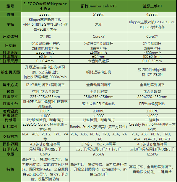 曾經(jīng),3D打印機(jī)是普通人遙不可及的工業(yè)級生產(chǎn)力用品,如今卻早已走入尋常百姓家。消費(fèi)級3D打印機(jī)的快速普及,國內(nèi)3D品牌商起到了重要的推動作用。國產(chǎn)3D打印機(jī)也風(fēng)靡全世界,各大品牌紛紛國內(nèi)外市場兩開花,眾多新品輪番上陣。對于剛接觸3D打印機(jī)領(lǐng)域的新人,如果要說有什么建議的話,本人會建議先入手門檻相對較低的FDM打印機(jī),這是因為FDM 3D打印機(jī)技術(shù)已經(jīng)比較成熟,而且價格相對便宜。那么盤點國內(nèi)知名FDM 3D打印機(jī),有哪款更具性價比,更值得推薦,本人這次選擇了在網(wǎng)友呼號聲中比較高的ELEGOO愛樂酷Neptune 4 Pro、拓竹Bambu Lab P1S和創(chuàng)想三維K1。通過近距離的一番親身使用和橫評測試,希望能給大家一點參考。