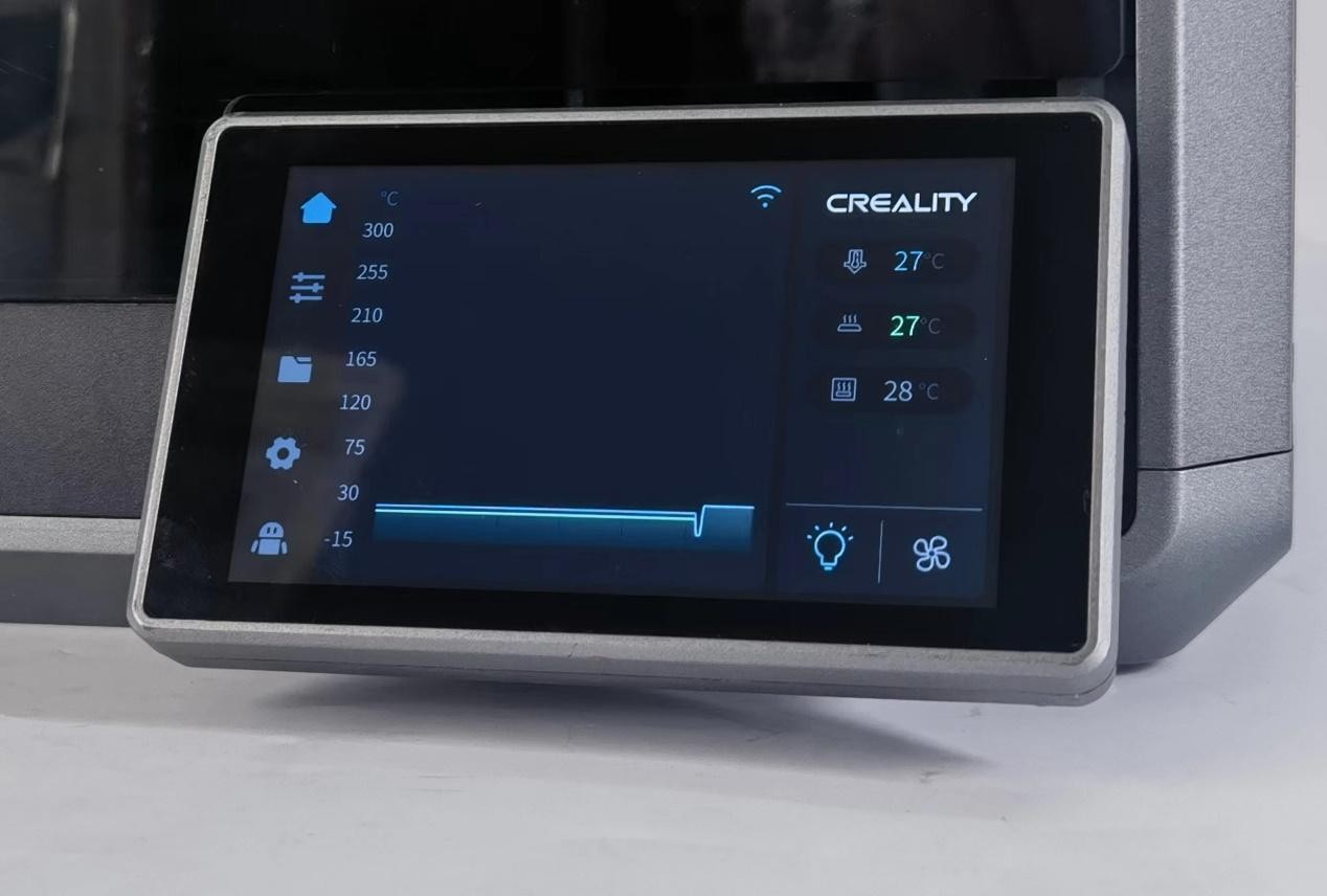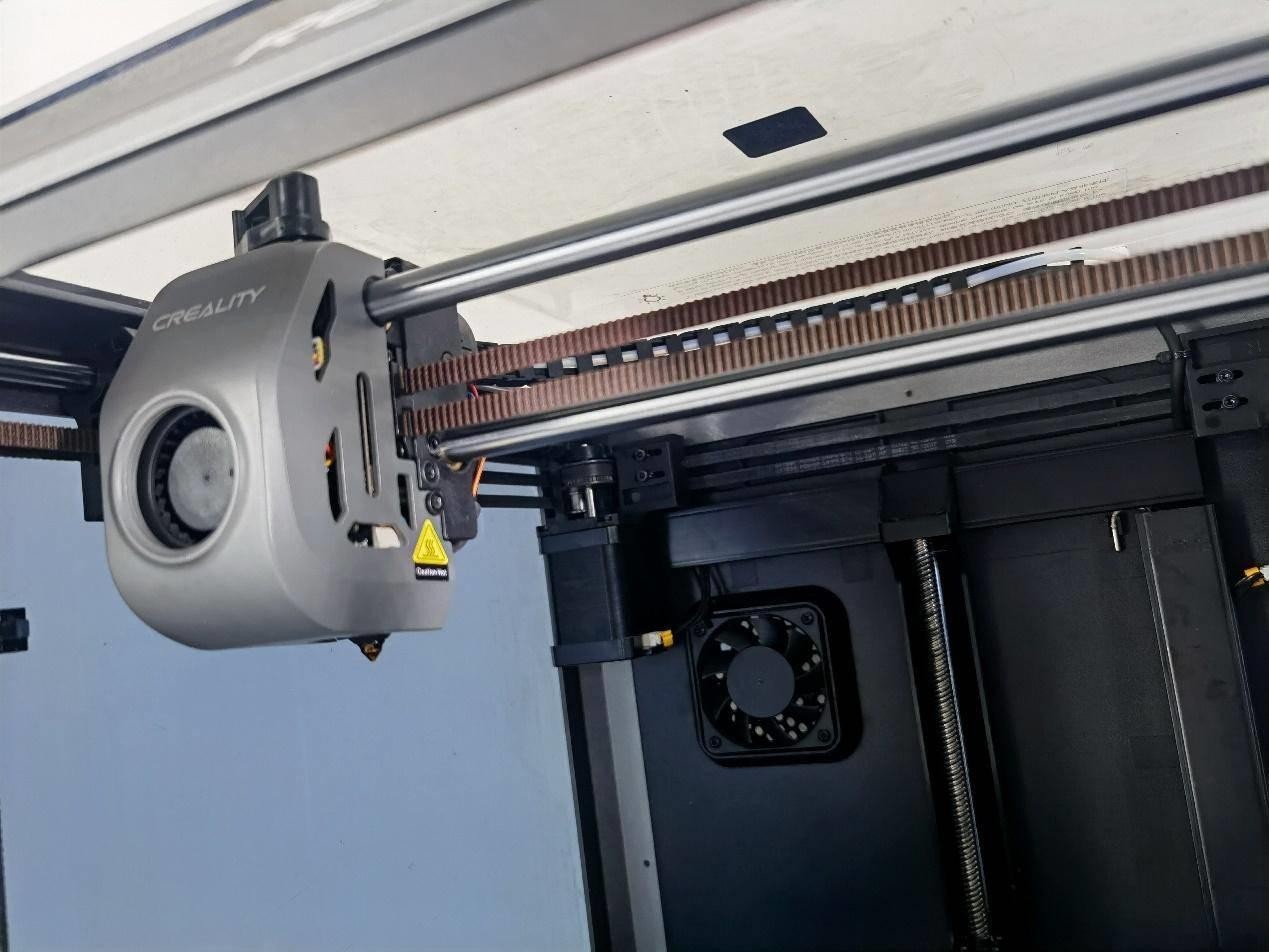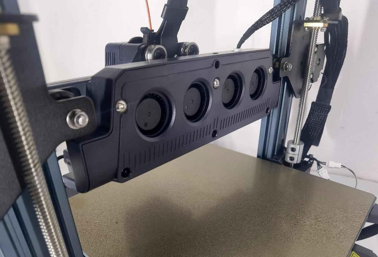 在散熱冷卻方面,除了在后板上安裝機(jī)箱風(fēng)扇來控制腔體溫度,創(chuàng)想三維K1還在機(jī)器的右側(cè)板上安裝了一個18W的輔助渦輪散熱風(fēng)扇。該風(fēng)扇專門用于對當(dāng)前打印的層進(jìn)行吹風(fēng),進(jìn)一步增強(qiáng)模型的冷卻效果,可有效減少拉絲和翹曲現(xiàn)象。