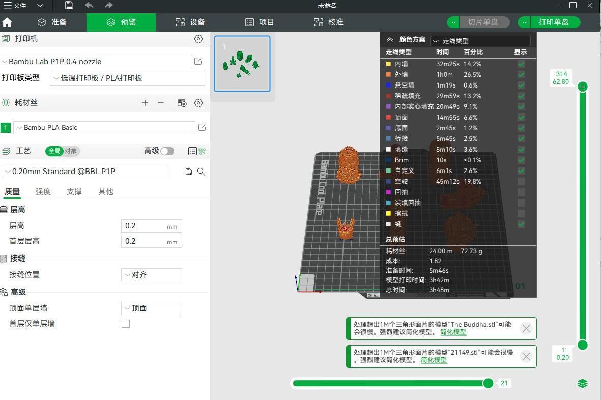 這三個品牌均推出了自家的切片軟件,當(dāng)然三款機(jī)器也可以支持第三方軟件。按照操作切片完成后,就可以準(zhǔn)備打印了。此次打印,為了更好地檢驗這三臺機(jī)子的打印水準(zhǔn),計劃一次性打印多個模型文件。軟件顯示,ELEGOO愛樂酷Neptune 4 Pro預(yù)計打印時間3小時44分鐘,拓竹Bambu Lab P1S是3小時48分鐘,創(chuàng)想三維K1預(yù)計打印時間4小時24分鐘。當(dāng)然,這與設(shè)置的打印速度有一定關(guān)系。
