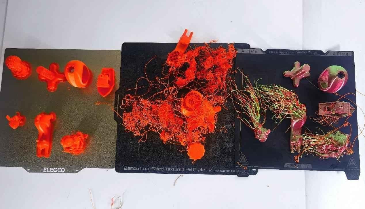 將打印平臺取下,上面就是三款機(jī)器打印出來的成品模樣。下面,再具體對比一下打印出來的各個件。