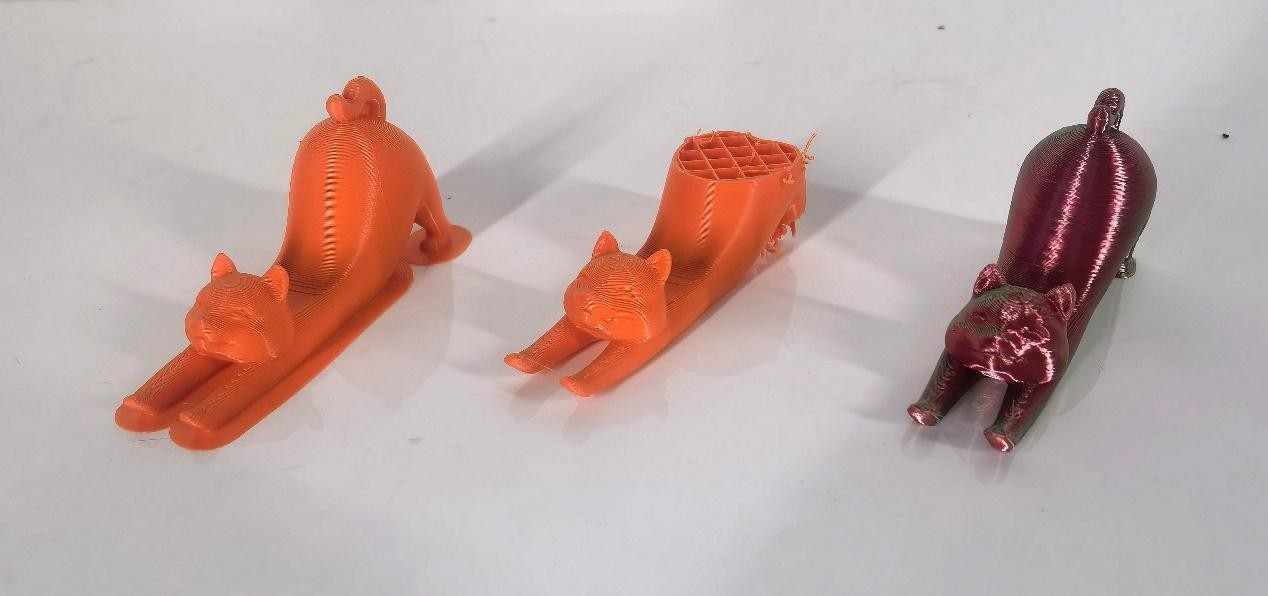 首先是一個貓咪模樣的手機(jī)架,可以看到ELEGOO愛樂酷Neptune 4 Pro和創(chuàng)想三維K1都完成了打印,整體造型和細(xì)節(jié)都比較完美。拓竹Bambu Lab P1S只打印出來了大部分,貓屁股缺失。