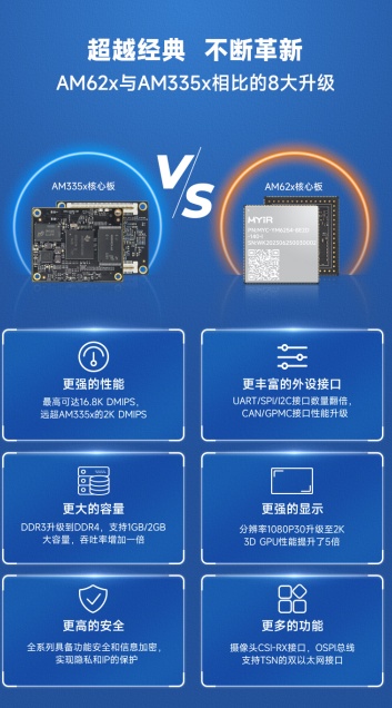 AM335x是TI經(jīng)典的工業(yè)MPU,它引領(lǐng)了一個(gè)時(shí)代,即工業(yè)市場從MCU向MPU演進(jìn),幫助產(chǎn)業(yè)界從Arm9迅速遷移至高性能Cortex-A8處理器。隨著工業(yè)4.0的發(fā)展,HMI人機(jī)交互、工業(yè)工控、醫(yī)療等領(lǐng)域的應(yīng)用面臨迫切的升級需求,AM62x處理器作為TI Sitara?產(chǎn)品線新一代MPU產(chǎn)品,相比上一代經(jīng)典處理器AM335x具備更高性能及功能擴(kuò)展性,在內(nèi)核、GPU、存儲(chǔ)、顯示、安全、外設(shè)等6大方面實(shí)現(xiàn)性能大升級。