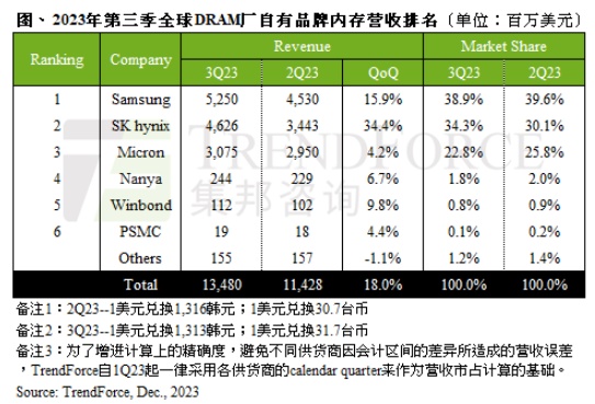 第三季營(yíng)收方面,三大原廠營(yíng)收皆有所成長(zhǎng),由于AI話題熱度持續(xù),對(duì)高容量產(chǎn)品需求維持穩(wěn)定,加上1alpha nm DDR5量產(chǎn)后,量?jī)r(jià)齊升,帶動(dòng)三星(Samsung)第三季DRAM營(yíng)收季增幅度約15.9%,約52.50億美元。SK海力士(SK hynix)受惠于HBM、DDR5產(chǎn)品的質(zhì)量相對(duì)穩(wěn)定,出貨量已連續(xù)三個(gè)季度成長(zhǎng),加上平均銷售單價(jià)季增約10%,營(yíng)收約46.26億美元,季增幅度達(dá)34.4%,是原廠中成長(zhǎng)最顯著的業(yè)者,與三星的市占率差距縮小至不及5%。美光(Micron)平均銷售單價(jià)小幅下跌,然因需求回溫,出貨量增加,支撐營(yíng)收季增幅度約4.2%,達(dá)30.75億美元。