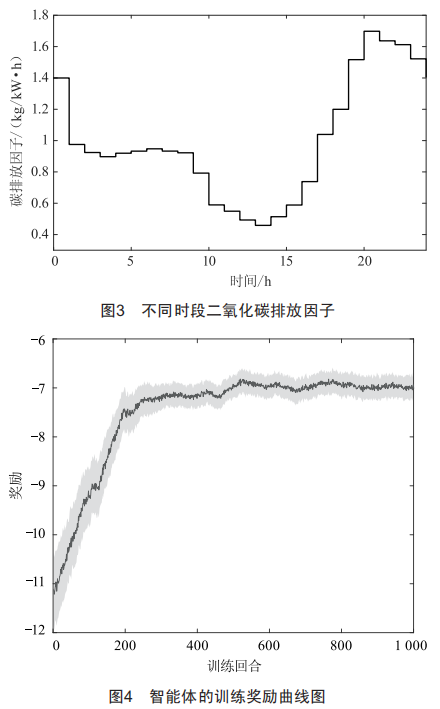 3)獎(jiǎng)勵(lì)rt是環(huán)境對(duì)智能體動(dòng)作at的及時(shí)反績(jī)。依據(jù)上文建立的優(yōu)化模型,本文設(shè)計(jì)獎(jiǎng)勵(lì)rt包含二氧化碳排放成本CCO2以及運(yùn)行成本兩項(xiàng),其中運(yùn)行成本包含購(gòu)電成本C1與儲(chǔ)能損耗成本C2: