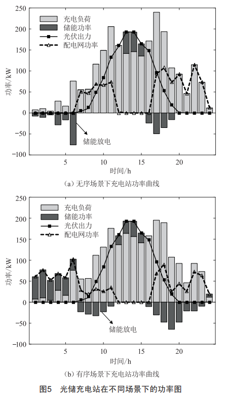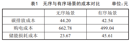 光儲(chǔ)充電站在無(wú)序與有序場(chǎng)景下的功率曲線如圖5所示,無(wú)序與有序場(chǎng)景的成本對(duì)比如表1所示。