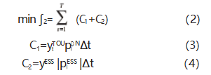 運(yùn)行成本最低。光儲(chǔ)充電站通過(guò)能量管理系統(tǒng)對(duì)站內(nèi)能量流動(dòng)進(jìn)行控制,從而降低整站的運(yùn)行成本,其中運(yùn)行成本可以分為向電網(wǎng)購(gòu)電成本以及儲(chǔ)能損耗成本兩部分: