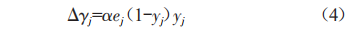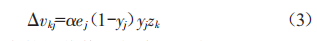 在誤差反向傳遞中,計算實際輸出與目標(biāo)輸出之間的差值,采用梯度下降法修正各層的權(quán)值和閩值,其中ej表示第j個節(jié)點的輸出值,yj表示記錄輸出值,xi表示記錄輸入值,a、β表示修正率。在隱藏層和輸出層激活函數(shù)采用對數(shù)S型激活函數(shù)時,從隱藏層節(jié)點至輸出層節(jié)點的權(quán)值修正如式(3)所示: