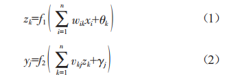 在BP神經(jīng)網(wǎng)絡(luò)中,輸入向量設(shè)為X=(x1,x2,…,xn)T;輸出層的輸出向量設(shè)為y=(y1,y2,…,yn)T;隱藏層的輸出向量設(shè)為z=(z1,z2,…,zn)T。從輸入層節(jié)點至隱藏層節(jié)點的權(quán)值設(shè)為wik,從隱藏層節(jié)點至輸出層節(jié)點的權(quán)值設(shè)為okj;隱藏層節(jié)點的閩值設(shè)為θk,輸出層節(jié)點的閩值設(shè)為yj;隱藏層激活函數(shù)設(shè)為∫1,輸出層激活函數(shù)設(shè)為∫2。