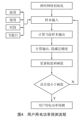 在用電行為識別策略中,BP神經(jīng)網(wǎng)絡(luò)輸入量考慮為以1 h為間隔的時間段、溫度、濕度、節(jié)假日,輸出量為用戶用電功率。用戶用電功率預(yù)測流程如圖4所示。
