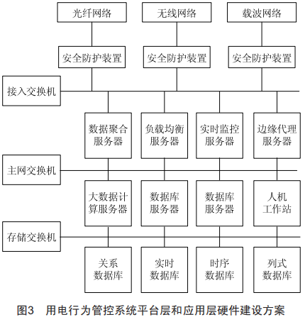 用電行為管控系統(tǒng)平臺層提供網(wǎng)絡(luò)管理、設(shè)備管理、用戶管理、運行監(jiān)控和安全監(jiān)控功能;應(yīng)用層用于建設(shè)用電行為管控主站系統(tǒng),對管轄區(qū)域的各用戶用電行為進行統(tǒng)一的管理。用電行為管控系統(tǒng)平臺層和應(yīng)用層硬件建設(shè)方案如圖3所示。