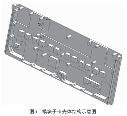 模塊子卡殼體材料選取的是鋁合金5A06,內(nèi)部凸臺具體位置以及高度依據(jù)相對應模塊上芯片具體尺寸而定,子卡殼體內(nèi)部凸臺結(jié)構(gòu)如圖5所示,另會依據(jù)印制板(PCB板)具體布線以及子卡殼體結(jié)構(gòu)強度要求來確定螺釘固定位置。