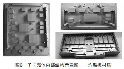 有些模塊中含有更大功率發(fā)熱元器件時,例如電源芯片、光模塊等,模塊子卡殼體一般采用均溫板材質(zhì)(即均熱板),同樣均溫板材質(zhì)子卡殼體結(jié)構(gòu)內(nèi)部也加工有多個凸臺,電子元器件的熱量通過導熱硅膠傳輸?shù)酵古_上再到子卡殼體上,再通過機箱接觸面將熱量散發(fā)出去。使用均溫板材質(zhì)加工的子卡殼體內(nèi)部結(jié)構(gòu)如圖6所示。