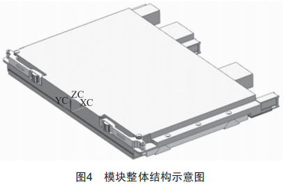 模塊內(nèi)部有各種芯片及電子元器件等,均屬于發(fā)熱元器件,無法實現(xiàn)自然冷卻。所以在實際模塊設計中將發(fā)熱元器件的熱量傳導至模塊冷板對應的凸臺上,在各芯片與凸臺之間會通過0.5 mm或者1 mm厚度導熱硅膠進行30%左右壓縮量的壓縮貼合,將熱量傳導至模塊的冷板上,再通過冷板兩側(cè)熱傳導面將熱量傳導至機箱。整個模塊示意圖如圖4所示。