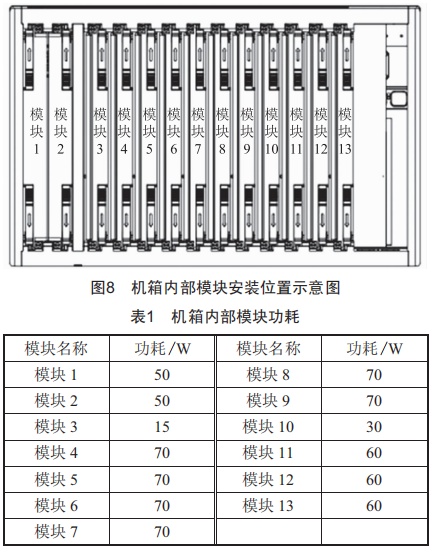 該液冷機箱內(nèi)部各模塊安裝位置溫度如圖8所示,機箱總功耗為745 W,其中機箱內(nèi)部各模塊功耗如表1所示。