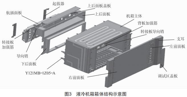標準6U機箱,外形尺寸為540 mm(長)X288.1 mm(寬)X270 mm(深,不包含導向銷長度),該機箱箱體主要由機箱主體、前面板組件(包括支耳、左前面板、右前面板、調(diào)試區(qū)面板)、背板加強筋、后面板組件(包括上后面板、上后面板蓋板、下后面板、航插面板、導向銷等)和流體連接器插座等組成,如圖3所示。