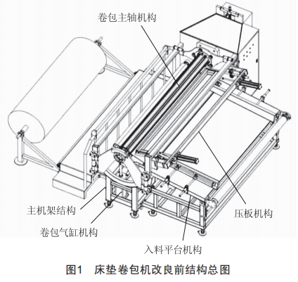 床墊卷包機(jī)改良前結(jié)構(gòu)如圖1所示,卷包工作主要有以下三個(gè)動(dòng)作流程: