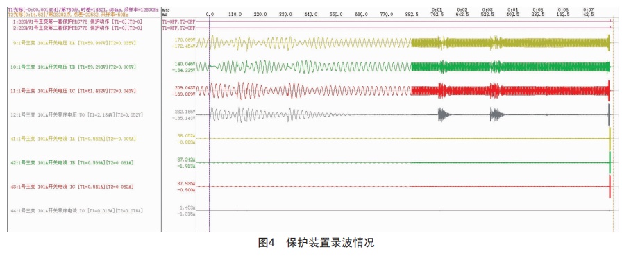 檢查故障錄波器(圖4)發(fā)現(xiàn),11月21日00:27:02.822,主變保護(hù)故障錄波器啟動(dòng),顯示B相單相接地,10 kV I段母線電壓頻繁波動(dòng)12 s后,B、C相相間短路,10 ms后發(fā)展成為三相短路,主變低后備過(guò)流2時(shí)限保護(hù)經(jīng)1.2 s延時(shí)動(dòng)作,跳開(kāi)101A開(kāi)關(guān)。三相二次側(cè)故障電流25.3 A(一次側(cè)電流15 180 A,主變低壓側(cè)允許出口短路電流41 878.32 A)。