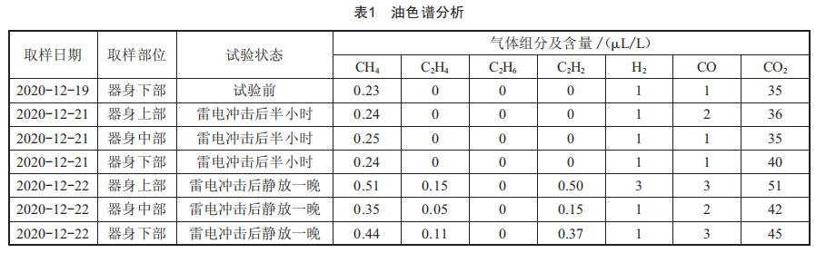 220 kv主變出廠試驗(雷電沖擊試驗),高壓C相第一次100%全波沖擊時有異常響聲,波形發(fā)生異常,波尾變短,示傷電流出現(xiàn)振蕩(圖1)[1],靜放12 h取油樣進行分析(表1),油中出現(xiàn)乙煥(C2H2),乙煥含量如下:器身上部0.5μL/L、中部0.15μL/L、下部0.37μL/L,試驗結(jié)果不符合技術(shù)協(xié)議及標(biāo)準(zhǔn)要求[2]。#2主變雷電沖擊試驗項目不合格,屬于重大質(zhì)量問題,如不及時處理會對項目進度和質(zhì)量造成重大影響。