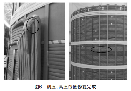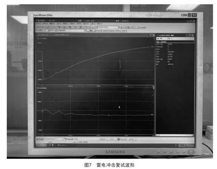 監(jiān)造組根據(jù)供應(yīng)商提供的處理方案對整改過程進行全程監(jiān)督見證。供應(yīng)商按照處理方案對C相高壓、調(diào)壓線圈進行修復(fù)(圖6),將破損引線絕緣剔除后重新加包,更換已經(jīng)損壞的圍屏紙板、角環(huán),檢查合格后,重新回裝線圈,監(jiān)造組根據(jù)制造廠家的處理方案,對制造廠家的處理過程進行全程監(jiān)督。處理完成后,制造廠家進行了雷電沖擊試驗復(fù)試,高壓C相雷電沖擊試驗復(fù)試通過(圖7)[3]。