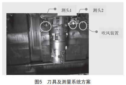 為降低刀具磨損及加工成本,本方案采用兩片CBN耐磨刀具,刀夾及僅桿可外脹收縮。測量系統(tǒng)選擇馬波斯雙測量系統(tǒng),即加工前檢測及加工后檢測。為保證能夠精準測量氣缸體上平面質(zhì)量,加工前及加工后檢測均選擇雙探頭,并在測頭增加吹風裝置,如圖5所示,防止加工過程中鐵屑影響測量結(jié)果。加工取雙探頭數(shù)據(jù)平均值作為最終測量值,并將數(shù)據(jù)反績給機床[5]。