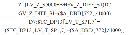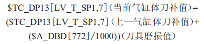其中,Z表示刀具進給深度;LV Z S5000表示氣缸體理論上平面位置尺寸;B表示止口深度中值;GV Z DIFF-S1表示實際氣缸體上平面與氣缸體理論差值,為變量,該數(shù)值為測量儀測得的數(shù)據(jù)轉(zhuǎn)化而來,測量儀測得數(shù)據(jù)為$A-DBD[752]/1000;D7表示刀具實際刀長,該值為變量,具體如下: