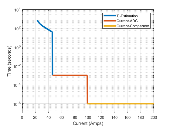 如圖2的時間-電流特性(TCC)曲線所示,電子熔絲包括三種過電流檢測方法,涵蓋從略微過電流到極高短路電流。TCC曲線定義了電子熔絲類似熔絲的行為,對低過電流的響應速度慢,對高過電流的響應速度快。