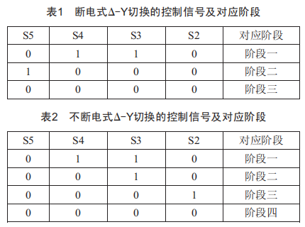 圖4中controller模塊是控制系統(tǒng),采用Simulink標(biāo)準(zhǔn)庫(kù)里的基礎(chǔ)模塊搭建,有五個(gè)控制信號(hào)S1~S5,用來(lái)控制K1~K5開(kāi)關(guān)的動(dòng)作,實(shí)現(xiàn)兩種Δ—Y切換,控制信號(hào)及對(duì)應(yīng)階段如表1、表2所示。