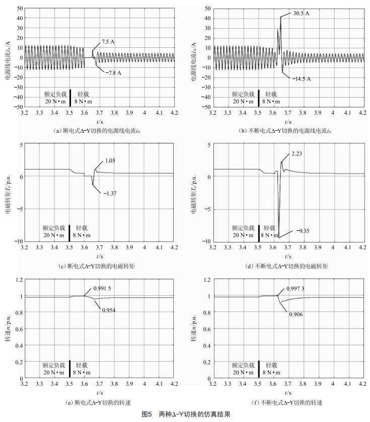 仿真過(guò)程中,電動(dòng)機(jī)額定運(yùn)行,第3.5秒負(fù)載由額定值20 N.m下降到8 N.m,第3.6秒執(zhí)行Δ—Y切換。兩種Δ—Y切換的電源線(xiàn)電流iA、電磁轉(zhuǎn)矩、轉(zhuǎn)速的仿真結(jié)果如圖5所示。