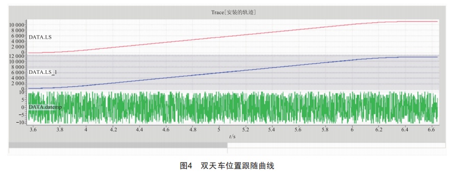 datemp為誤差值。實(shí)驗(yàn)現(xiàn)象及數(shù)據(jù)監(jiān)控表明,雙天車運(yùn)行平穩(wěn),同步性能較好。