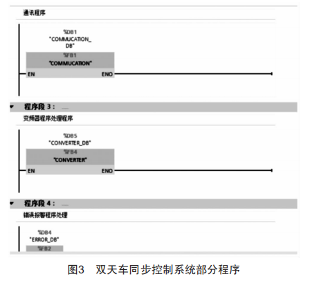 采用S7—1500系列PLC,結(jié)合博途軟件[7]進(jìn)行程序編輯,通過這些程序塊完成整個(gè)系統(tǒng)的運(yùn)行邏輯、信息傳遞及安全保護(hù)功能。程序主要包括:控制起升變頻器、大車變頻器及小車變頻器啟動(dòng)、停止、運(yùn)行方向及運(yùn)行速度的程序塊;采集起升變頻器、大車變頻器及小車變頻器信息狀態(tài)及傳感器反績(jī)距離信息的程序塊;對(duì)采集數(shù)據(jù)進(jìn)行濾波處理運(yùn)算的程序塊;對(duì)天車運(yùn)行狀態(tài)進(jìn)行判斷處理的程序塊;與操控系統(tǒng)信息交互的程序塊;與另一臺(tái)天車運(yùn)行信息交互的程序塊;通信超時(shí)判斷程序塊;手動(dòng)/自動(dòng)切換程序塊。部分程序如圖3所示。