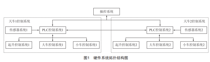 雙天車同步控制系統(tǒng)主要包括操控系統(tǒng)、天車1控制系統(tǒng)及天車2控制系統(tǒng),其中天車1控制系統(tǒng)(天車2控制系統(tǒng))包括傳感器系統(tǒng)1(傳感器系統(tǒng)2)、PLC控制系統(tǒng)1(PLC控制系統(tǒng)2)、起升控制系統(tǒng)1(起升控制系統(tǒng)2)、大車控制系統(tǒng)1(大車控制系統(tǒng)2)及小車控制系統(tǒng)1(小車控制系統(tǒng)2),硬件拓?fù)浣Y(jié)構(gòu)如圖1所示。