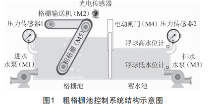 污水處理粗格柵池控制系統(tǒng)由進水水泵、粗格柵、格柵輸送機、電動閘門、排水水泵等組成,系統(tǒng)可以實現(xiàn)過濾污水中的懸浮雜物,并將過濾后的水送入后續(xù)污水處理凈化池的自動控制系統(tǒng)中。系統(tǒng)結構示意圖如圖1所示。