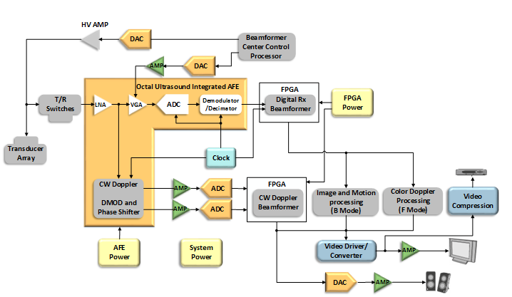 在醫(yī)療超聲整個(gè)行業(yè)中,ADI能提供低噪聲、低功耗模擬前端、精密放大器、轉(zhuǎn)換器以及電源等解決方案,在業(yè)內(nèi)擁有較高的知名度。從下面超聲整體解決方案的架構(gòu)圖中可以看到,除去探頭(Transducer)和FPGA的波束形成器(Beamformer)等這類(lèi)非芯片廠商產(chǎn)品,ADI的產(chǎn)品幾乎涵蓋了包括發(fā)射鏈路、接收鏈路等在內(nèi)的整個(gè)超聲系統(tǒng)。下面將依次從發(fā)射鏈路、接收鏈路、時(shí)鐘以及電源管理幾個(gè)方面來(lái)介紹一下ADI的相關(guān)代表產(chǎn)品和解決方案。
