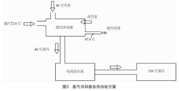 如圖3所示,首先啟動真空泵,將廢汽冷卻器的水側(cè)抽成真空狀態(tài),然后關(guān)閉真空泵。40節(jié)的冷水經(jīng)過廢汽冷卻器變成40節(jié)的低壓蒸汽,再經(jīng)過電動加壓泵,升壓后變成120節(jié)的蒸汽供給其他設(shè)備使用,這樣不但回收了廢汽的余熱,而且提高了蒸汽的用能品味,可謂一舉兩得。