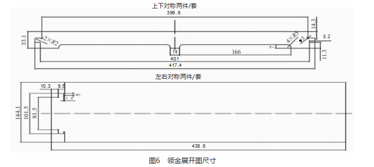 將圍框拆成四部分(圖5):上下對稱的兩部分和左右對稱的兩部分。這種拆圖方案既減少了折彎形式,又能減少工藝展開圖數(shù)量,便于控制加工工藝質(zhì)量。