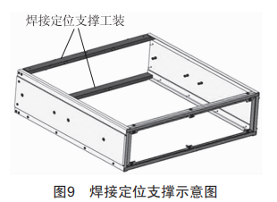 在圍框拆圖的過程中,綜合考慮了機(jī)箱承載能力和焊接質(zhì)量的需要,焊縫對稱于焊件截面的中性軸,減少了彎曲變形;因圍框的結(jié)構(gòu)形式為半敞開型,在焊接過程中,借用工件端頭上的孔,設(shè)計制作焊接定位支撐工裝(圖9)來增加剛性約束[3],減少焊接變形。
