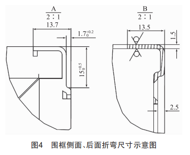 3)圍框兩側(cè)及后面均設(shè)計有Z型折彎(圖2~圖4),且Z型折彎高度與相鄰零件板厚接近,具有兩種高度。其中,與上/下蓋板連接處的Z型折彎高度為1.7 mm,與后面板連接處的Z型折彎高度為2.5 mm;折彎高度太小,已經(jīng)超出了常規(guī)數(shù)控折彎機(jī)及折彎刀具的加工極限;兩種高度,折彎或者沖壓模具需要“可調(diào)式”組合模具;圍框的成型不易通過一塊整料一體折彎成型。