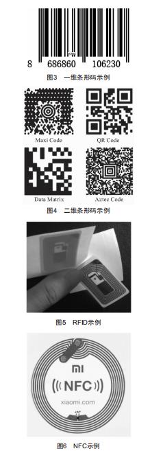 被動標識載體技術包括但不局限于一維條形碼、二維條形碼、RFID、NFC等,示例如圖3~圖6所示。