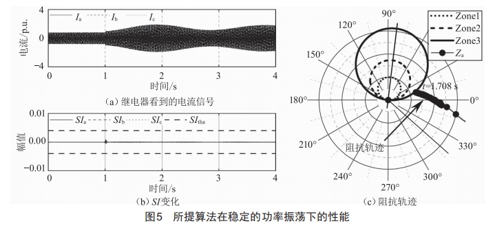 圖5(a)顯示了此時的電流波形。對線路1獲取的電流信號進行處理獲得SI波形,圖5(b)為所提算法的SI值,在1 s時,由于線路4的斷開,從線路1得到的SI值達到峰值,隨后線路經(jīng)歷振蕩。由圖5(C)可知,繼電器觀測到的阻抗在1.708 s入侵動作區(qū)域,但SI值低于閩值,所提方法檢測到振蕩并閉鎖距離保護,防止了繼電器錯誤動作。