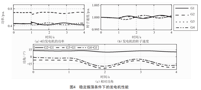為了模擬Line—1上的穩(wěn)定振蕩,考慮在1 s時斷開Line—4上兩端的斷路器。圖4(a)和(b)顯示了3臺發(fā)電機的功率和轉(zhuǎn)子角速度的變化,振蕩不會使它們脫離同步速度,所以這是一個穩(wěn)定的振蕩。圖4(C)顯示了G2、G3和G4相對于G1的轉(zhuǎn)子角,在振蕩期間,相對角增加,然后在一定范圍內(nèi)開始振蕩。