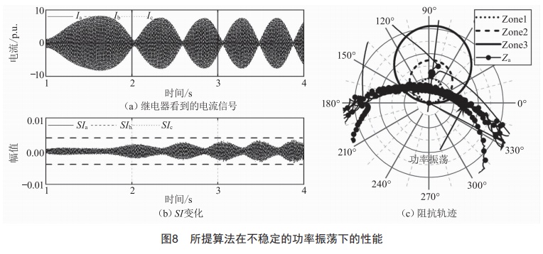 在失步的情況下,輸電線路跳閘有利于線路從不穩(wěn)定到穩(wěn)定的過渡,但跳閘需要根據(jù)系統(tǒng)的復(fù)雜性,由失步繼電器跳閘,距離繼電器應(yīng)能識別不穩(wěn)定的振蕩。圖8顯示了所提算法在不穩(wěn)定振蕩下的表現(xiàn),與其他振蕩相比,不穩(wěn)定振蕩期間SI值有明顯增加,但仍在上下限閩值內(nèi),因此算法在不穩(wěn)定振蕩期間仍能保持繼電器為閉鎖,不會出現(xiàn)誤操作。
