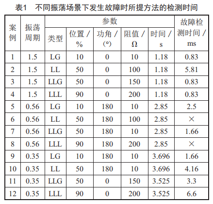 本節(jié)評估了所提方法在系統(tǒng)振蕩期間通過創(chuàng)建再故障場景來測試解除閉鎖的能力,測試結(jié)果如表1所示,變量涉及振蕩和故障,考慮快速和慢速振蕩的影響,對于不同振蕩周期的對稱振蕩,故障對所提方法的影響反映在故障電阻、位置和功角上,通過改變這些參數(shù)進行了相關(guān)場景的測試。